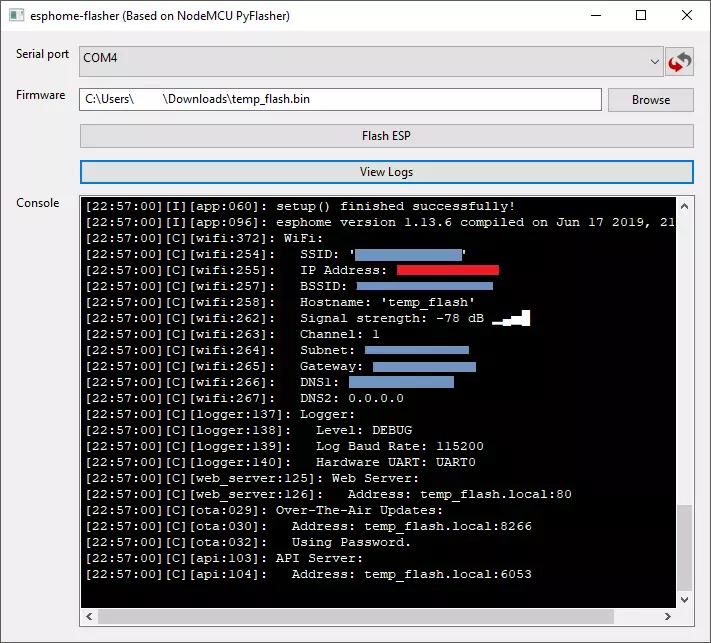 On sélectionne alors notre convertisseur dans la liste (“COM4” pour moi), on sélectionne le firmware récupéré auparavant et on clique sur “FlashESP”.