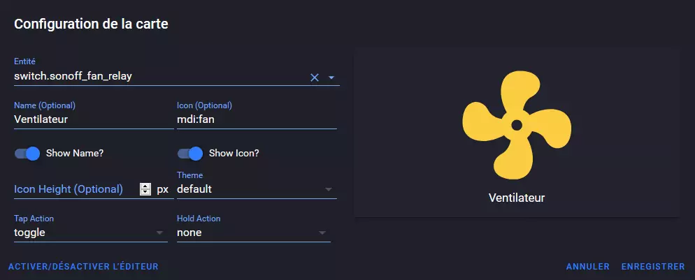 J’ai intégré le contrôle de mon ventilateur (donc du Sonoff) sur Lovelace (UI d’Home Assistant) par le biais d’un bouton avec la carte “Entity Button” configuré comme ceci :